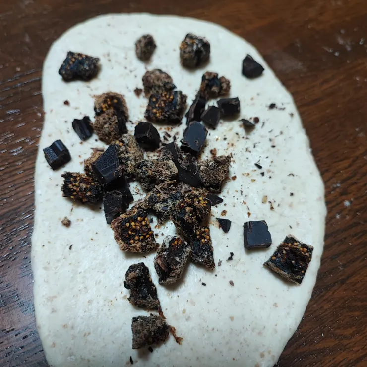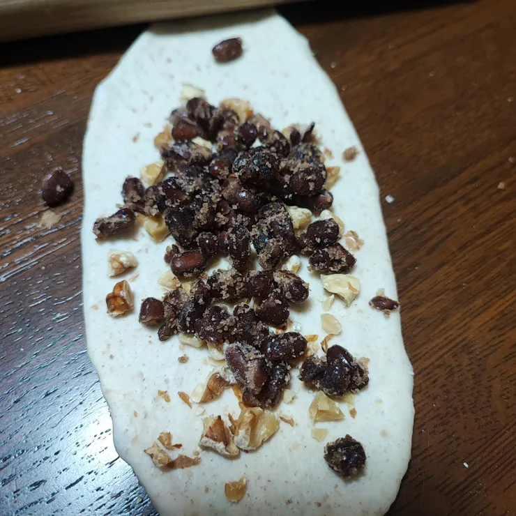 甘納豆とドライフルーツのパンが食べたいと言うので、小豆甘納豆とくるみ、高カカオチョコレートとドライフィグを包んだパンを作りました。