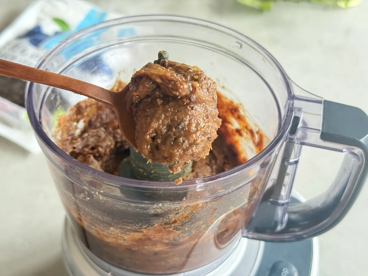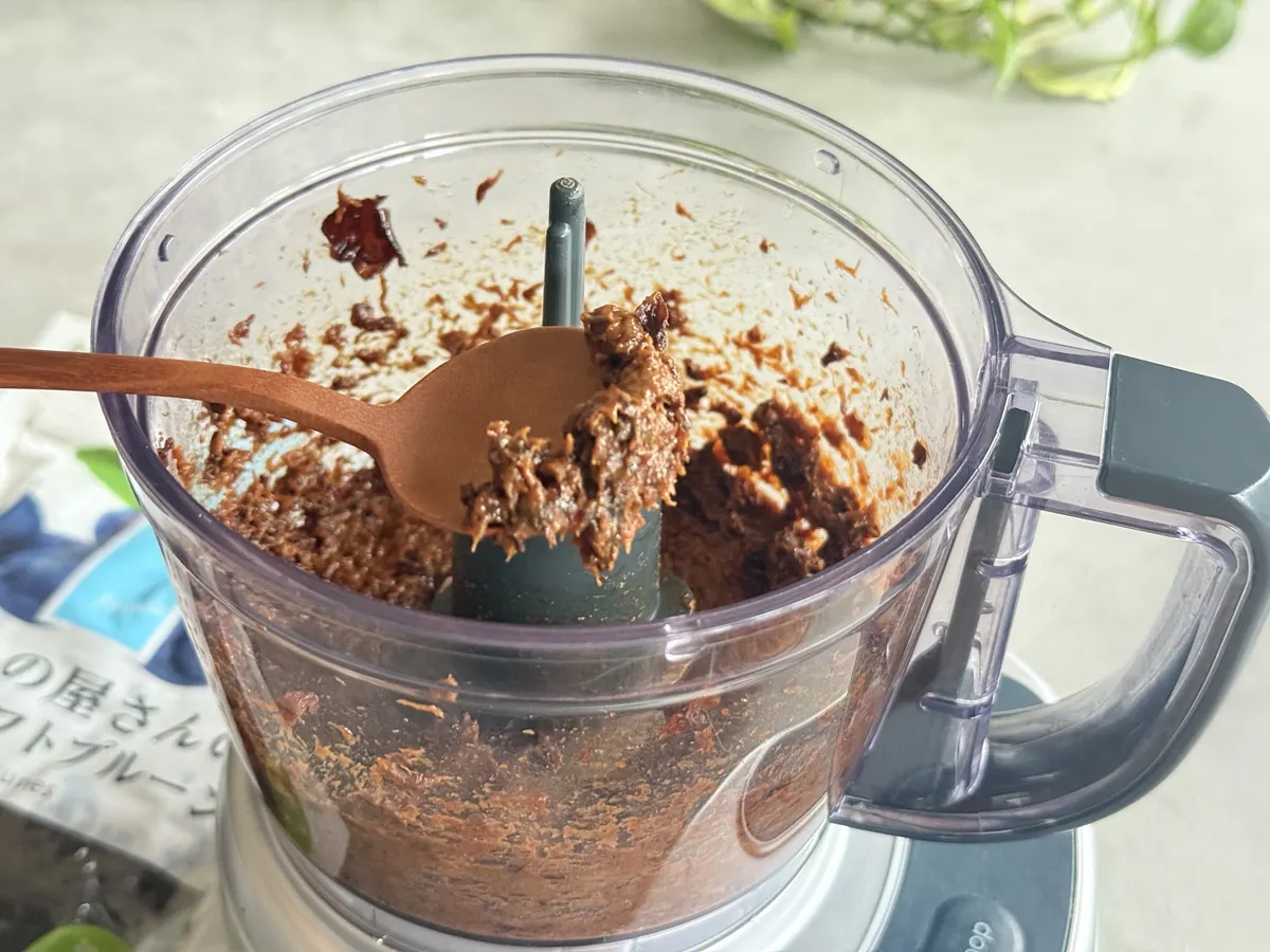 プルーン味噌に豆板醤少々、ごま油少々を入れ、水少々を加えて好みの滑らかさにする。