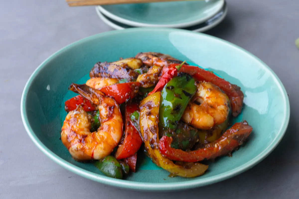 ◉海老とパプリカ、ピーマンのプルーン味噌炒め