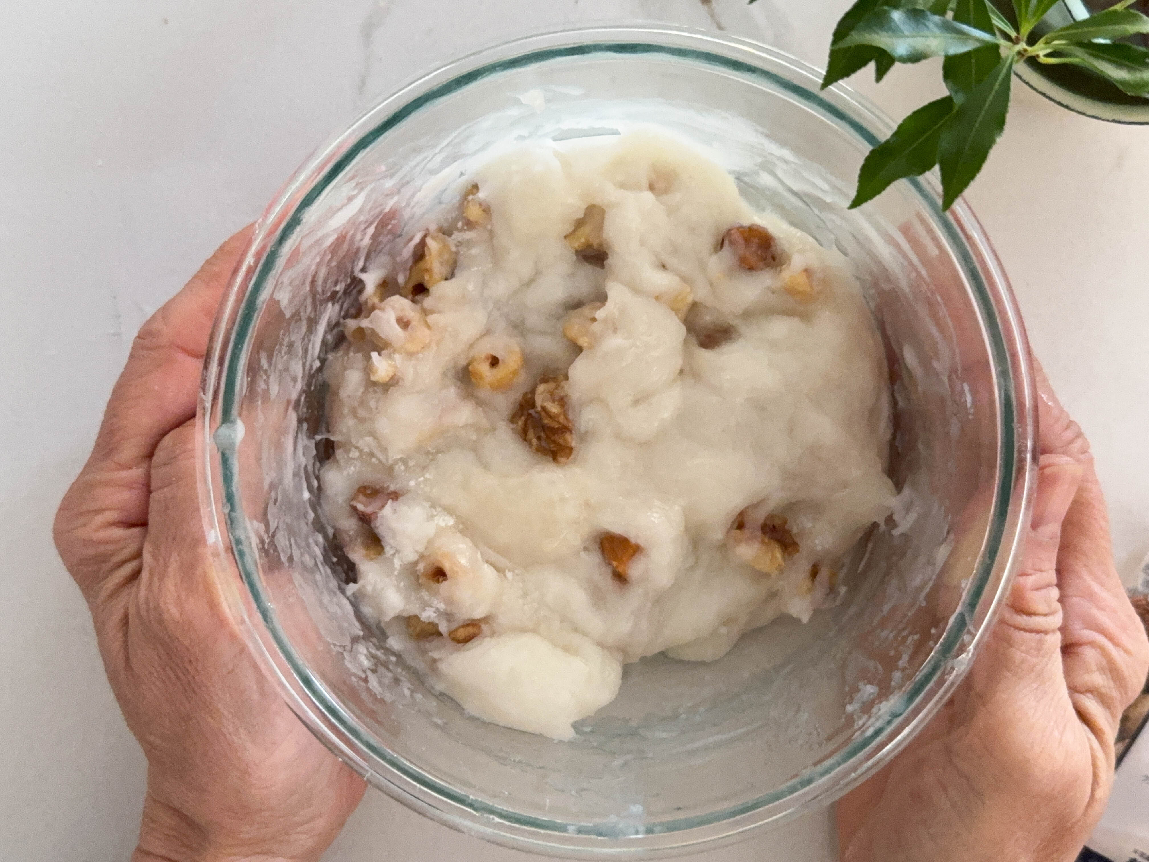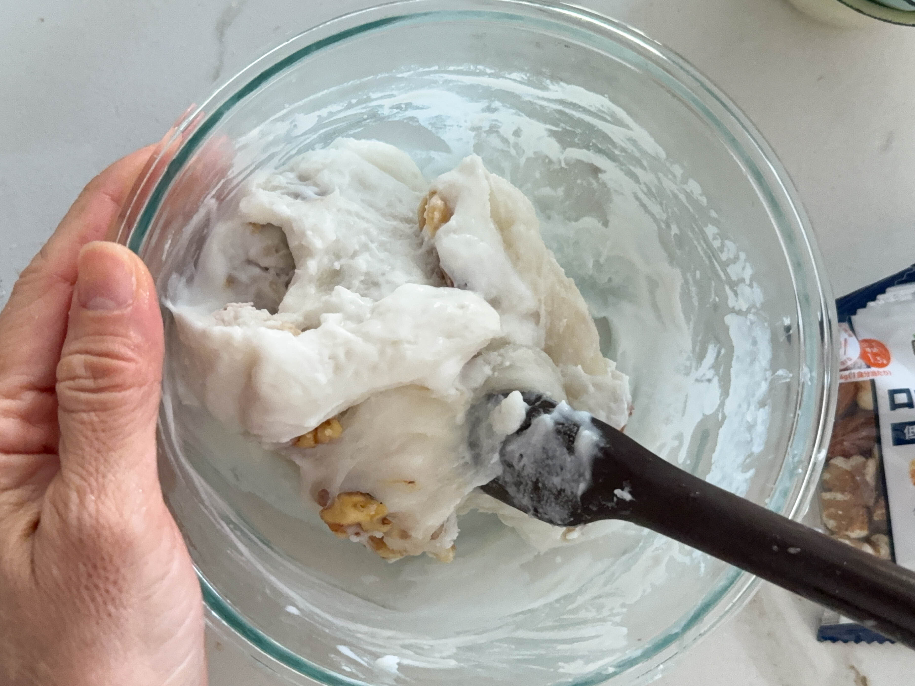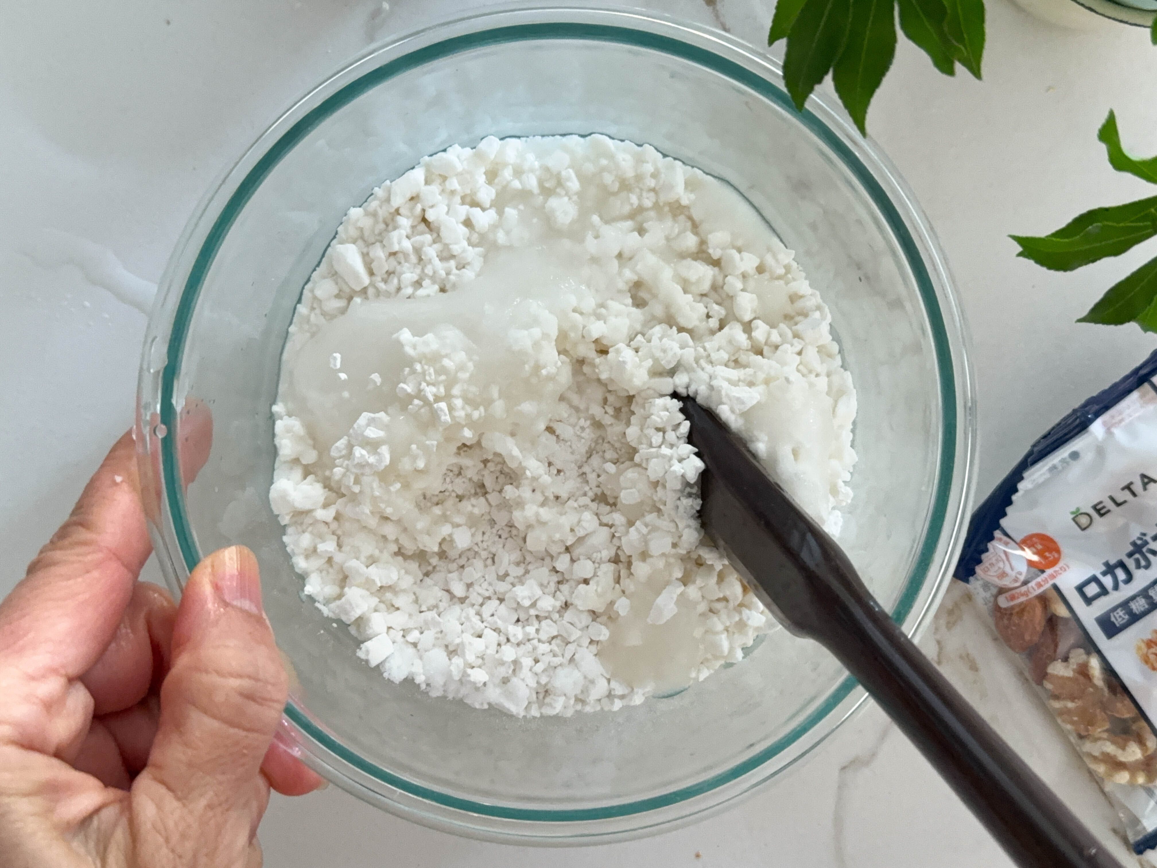 5.耐熱容器に白玉粉と砂糖を合わせ、水を少しずつ加えて混ぜる。更にロカボナッツを加えて混ぜる。