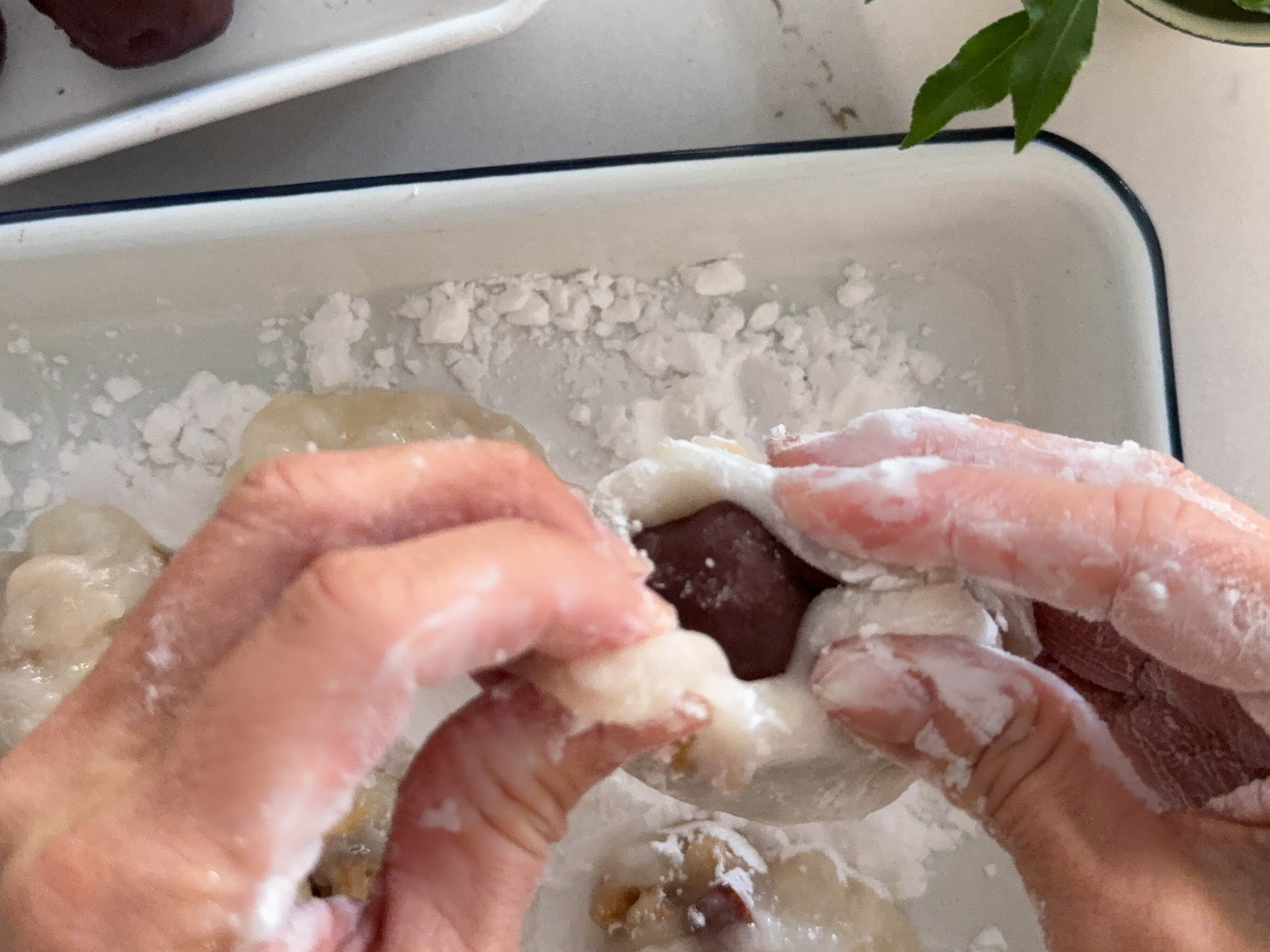 ※皮の上にあんをのせ、両側の皮を引っ張る様にして包み、上下を返して丸めて形を整える。