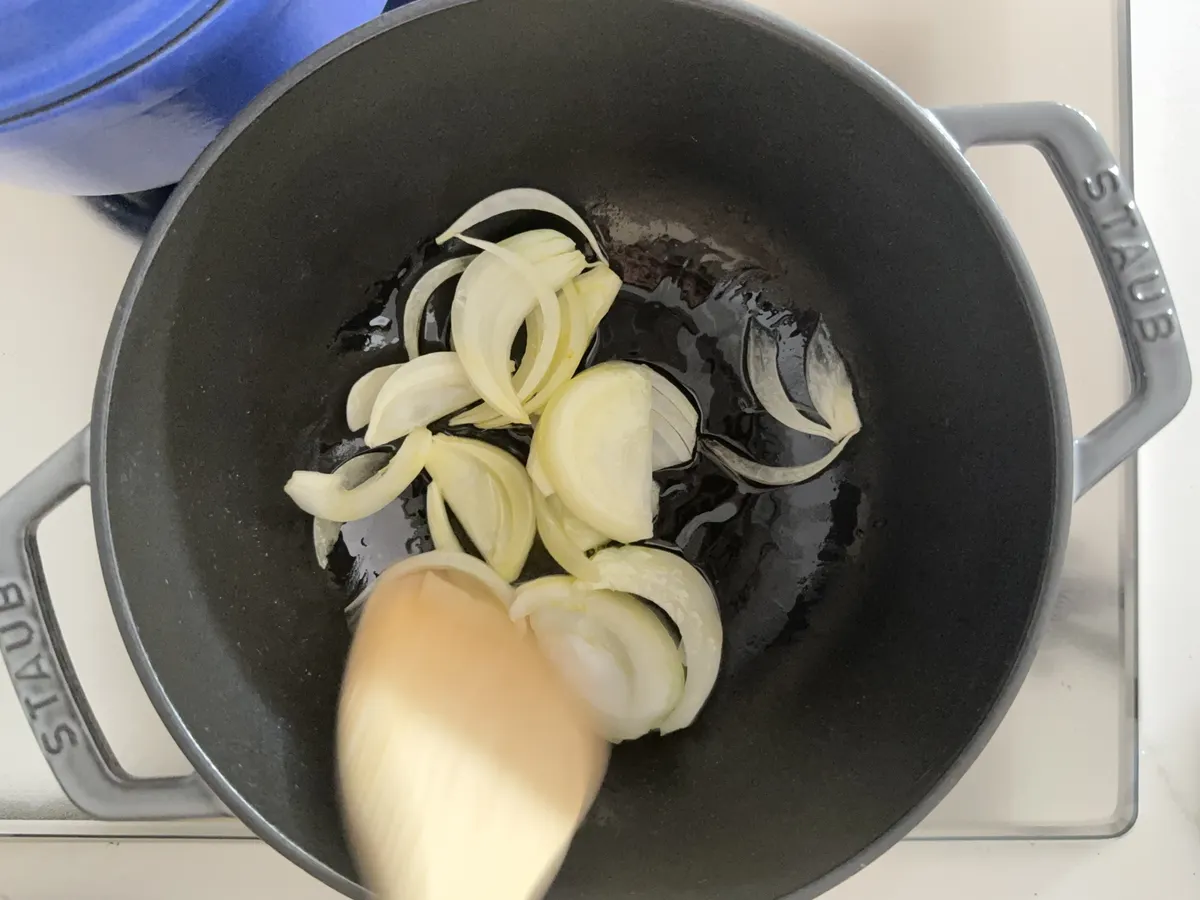 ④鍋にオリーブオイルを熱し、玉ねぎを炒める。