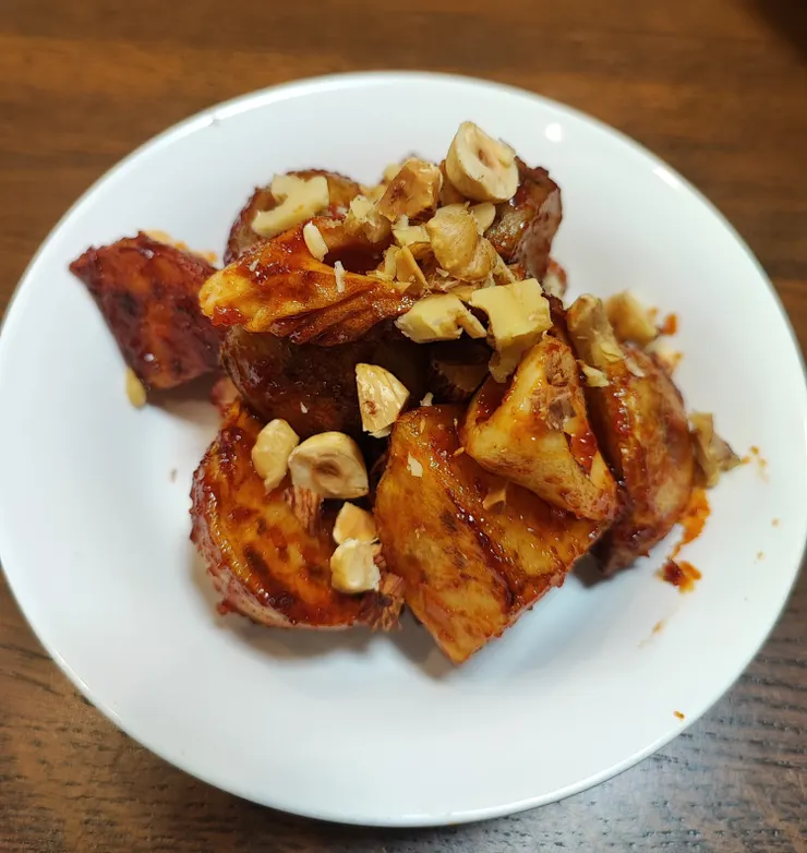 焼けた芋を一旦端に寄せ、空いたスペースにケチャップ大2,はちみつ大2、醤油大1、コチュジャン大さじ1弱、おろしにんにく小1を入れて混ぜ、ふつふつしたら芋全体によく絡めて、砕いたロカボナッツを振りかけたら出来上がり。