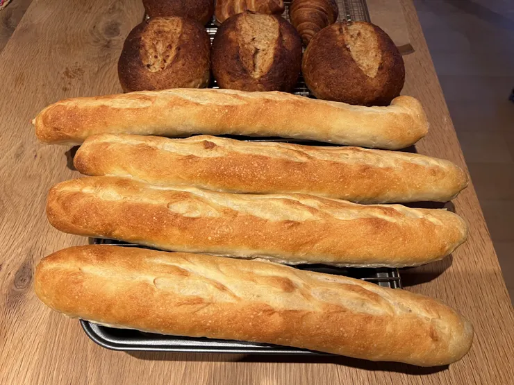 バゲット成形は一個目の生地が思いの外弛んでて長くなり過ぎましたが、麺棒一本分を意識したことで多少揃ってきました。クープもまずまず。
