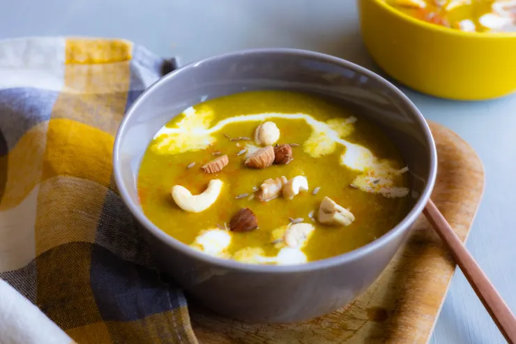 豆乳でまろやかさを出し、仕上げにクミンとカイエンヌペッパー、生クリームを回しかけます。