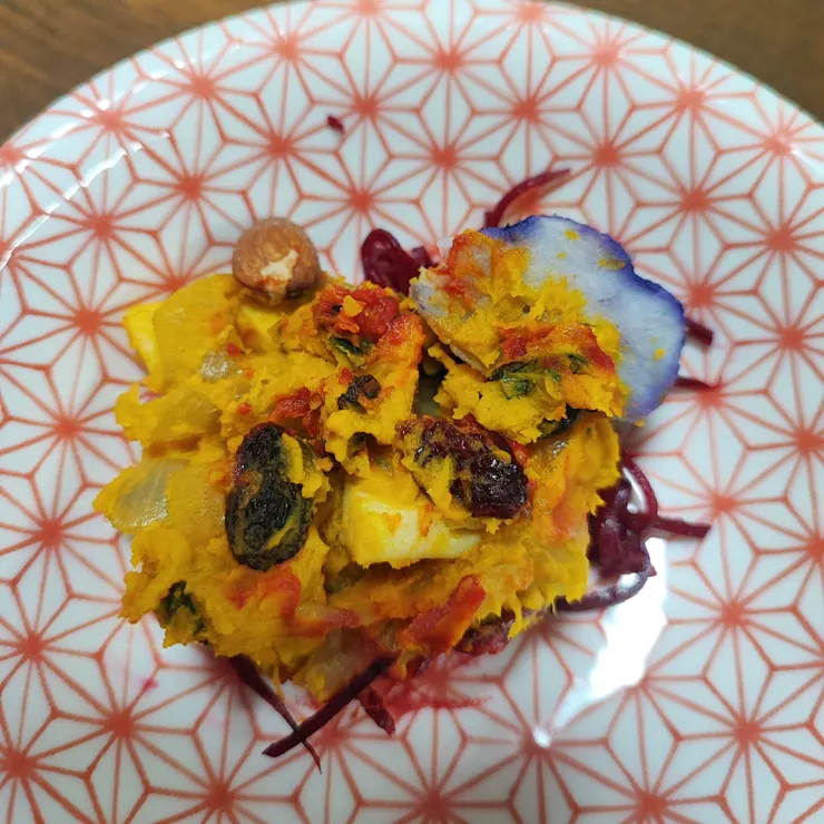 みみずをイメージしてロシア風ビートサラダを敷き、刻んだロカボナッツとレーズン、クランベリー入りかぼちゃサラダを乗せました。