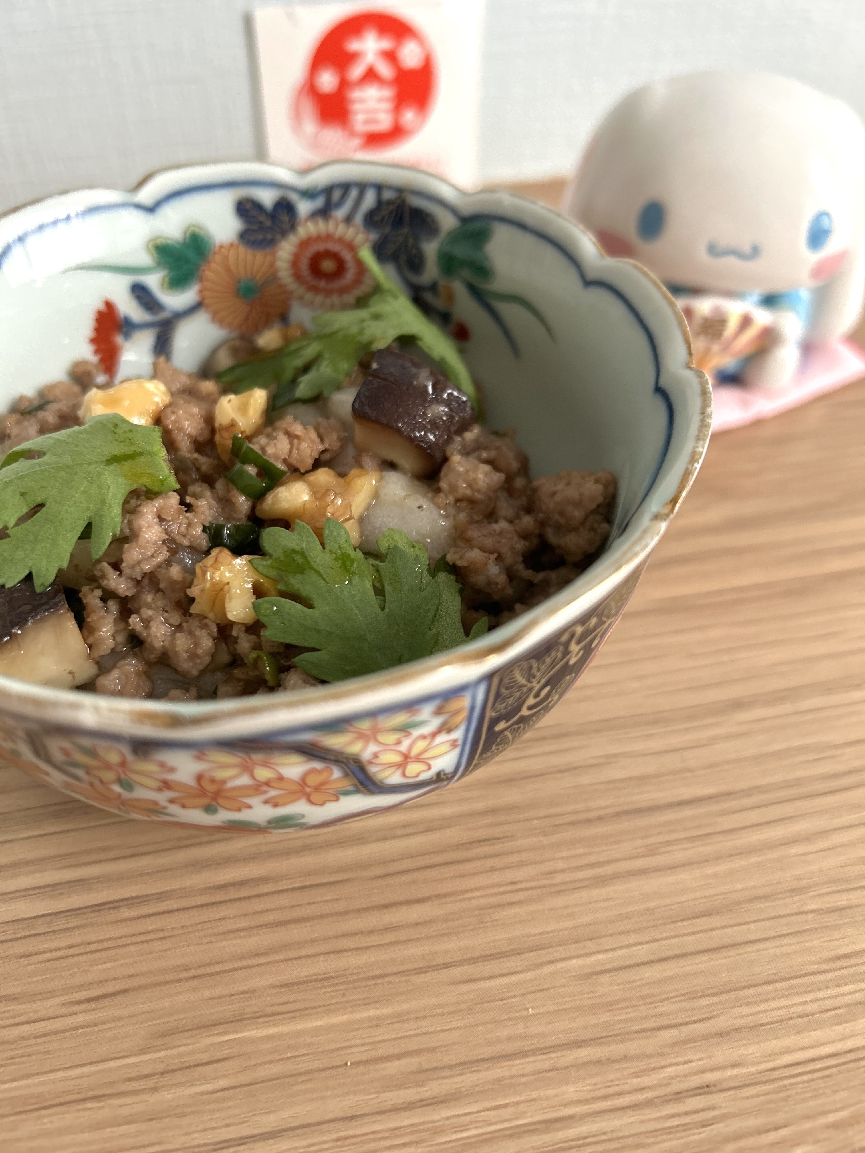 お餅と中華風の豚ひき肉・カリッとクルミの食感・みつばがなかったので春菊をのせました。