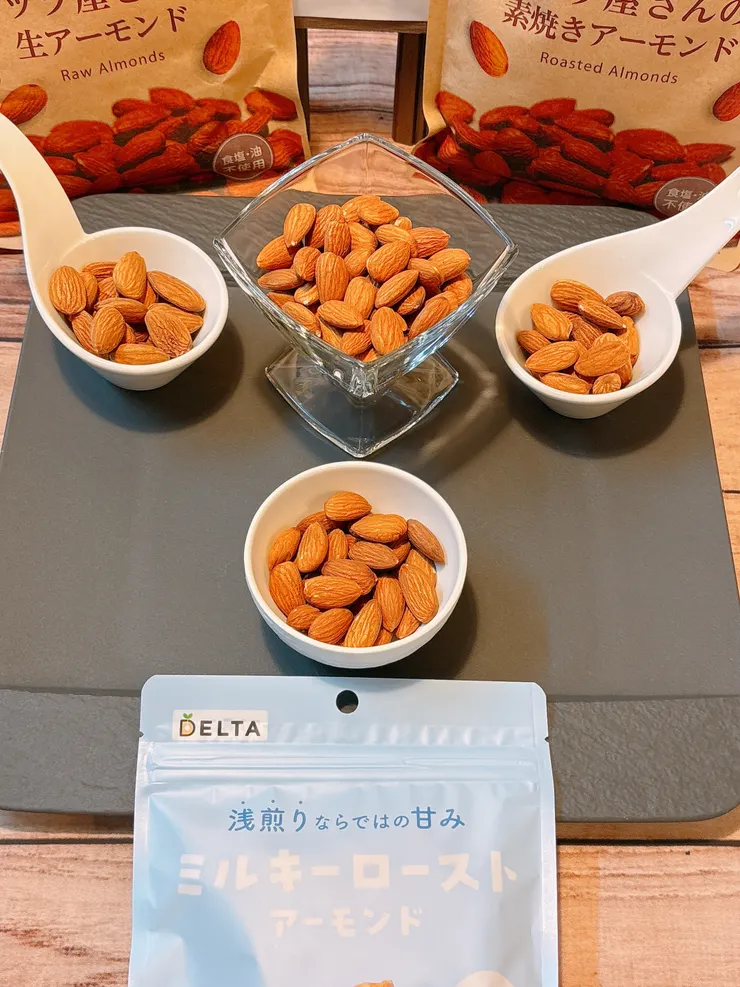 手持ちの「生アーモンド」「素焼きアーモンド」と贅沢に3種類食べ比べをしてみたのでレポートします!