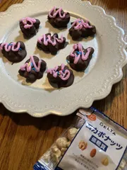 ナッツチョコ 板チョコ一枚湯煎して溶かしたらナッツ入れて混ぜスプーンですくいクッキングシート上にのせ冷やして固まったら完成!子供にも好評でした!