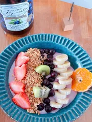 粉末の飲むアサイーボールなるものを買ったので、ヨーグルトに混ぜてみました。少なかったのかな?😅色が薄いトッピングし、問題なくモリモリ食べました