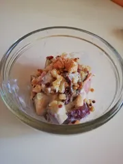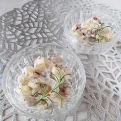 課題のサラダ作りました。ギリギリ💦連日の雨で外出してなくて、材料が全部揃わなかったのですが、予定があり、今日しか作れる日が無いので💦クリームチーズをマヨーネズに変えてヨーグルトの量を減らして、自家製ベーコンと自家製ドライパセリを使って作りましたm(__)m ナッツの食感と、玉ねぎの食感と甘