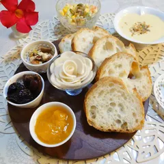 プルーン味噌つくりました😋 先日頂いたカッティングボードに盛り付けました😄タレで汚れちゃいそうなので、小皿にのせました💦鶏むね肉を薄切りして、甘酒とプルーン味噌に漬け込み、薄力粉をまぶして米油でソテー。プルーン味噌にマヨネーズを混ぜてディップにして、プルーン味噌と一緒にスライスした蕪にのせました😋 美味しいおつまみに