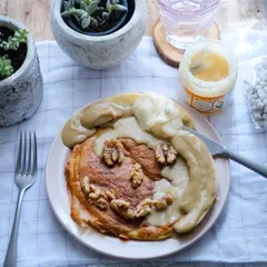 柔らかめに焼いたパンケーキに、蜂蜜やバナナや練りごまという歯が要らない系の食材を合わせ、アクセントにはカリカリな歯応えの胡桃を。2026年もこのアクセントに魅了されています。毎度の食べ方ですが、変わらぬ好きを頂きました。
