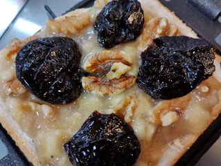 フルーティーなホットサンド バナナペーストにプルーンとくるみのホットサンドを作ってみました。写真は焼く前のものです。水分のある具材を焼くとパンがしなこくなって噛み切りにくくなるので包丁でブスブスパンを刺しておくのがコツです。