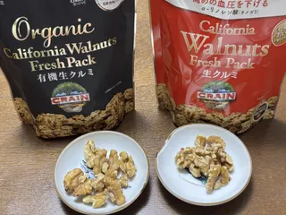 食べ比べ 晩酌のおつまみに食べ比べしてみました。有機生くるみの方がやっぱり少し旨味が濃くてうまい気がしました。
