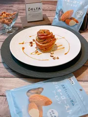 スライスしたりんごをトースターでサラッと焼いて、 デルタの「ミルキーローストアーモンド」を贅沢にサンド。 仕上げにキャラメルソースをかけたら、 見た目も華やかな“りんごタワー”の完成です✨ 上からナイフとフォークでザックリと崩しながら食べるのが醍醐味。 ミルキーなアーモ