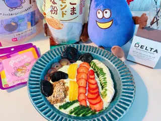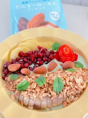 朝のヨーグルトボールにトッピング 昨夜もたらふく食べたのに、朝もミルキーローストアーモンドを。 バナナは焼いたほうが体を冷やさないとのことで、トースターで皮を剥いて加熱しました