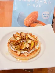 タルティーヌ 綺麗にカットできる「ミルキーローストアーモンド」いいねぇイングリッシュマフィンにクリームチーズとサワークリームを混ぜて塗り、バター焼きしたさつまいも🍠りんご🍎ハーブソルト振りかけて〜(かけ過ぎた😱って思ったけど、味はちょうど良かった)見た目汚くなりました🤣 アーモンドとハチミツかけてうま過