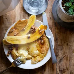 甘ジョッパイ パンケーキ クリスマスにカマンベール丸ごと一個と、胡桃とバナナのパンケーキ。いつもより、少し贅沢しました!