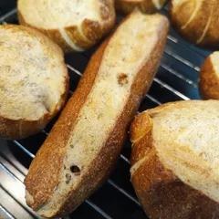 くるみあずきパン いつもパン生地にくるみと小豆甘納豆をつめこみ焼きました。これだけへろへろな仕上がりになってしまったので、ちゃんと焼けたパンで囲んで誤魔化そうとしましたが、かえって目立つように…😅こちらは冷凍して頑張りたい日に焼き直して食べます!