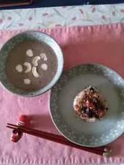 今日のランチ 今月のレシピきのこカシューナッツポタージュやきおにぎりに先月のプルーンみそのせました