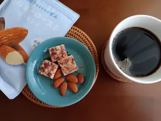 家事の合間のティータイム コーヒーとのペアリングはとっても美味しくて癒されますね😋 カリッと香ばしいミルキーアーモンドの甘さが引き立ちます😋