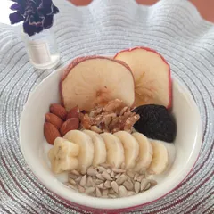 朝のヨーグルトボウル 朝のヨーグルトボウルにミルキーローストアーモンド、生クルミ、プルーン、バナナ、ひまわりの種、自家製干しりんご、コラーゲンをいれました。 すみません。パッケージを入れ忘れました💦