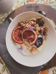 デルタさんのスライスアーモンド、クルミ、クランベリー、グランデレーズン入りの自家製グラノーラのヨーグルトボウルです。プルーンとセミドライ気味に仕上げたブラッドオレンジも添えました。^_^