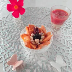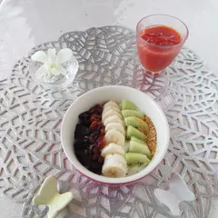朝のヨーグルトボウルに、キウイ、プルーン、ドライフルーツミックス、ビーポーレン、みらいのこうそ、りんごジャムを入れました😋トマトジュースには、アマニ油を入れました💓