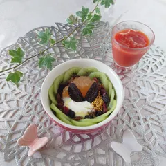朝のヨーグルトボウル 朝のヨーグルトボウルに、キウイ、プルーン、ドライフルーツミックス、ビーポーレン、みらいのこうそ、りんごジャムを入れました😋トマトジュースには、アマニ油を入れました💓