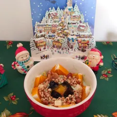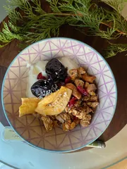 朝活プ活 婆様に冬のヨーグルトはさぶぃ活。 デルタさんのナッツ&ドライフルーツオンパレードのヨーグルトボウルモーニングです♪ ノンオイル自家製麹甘酒グラノーラにはナッツたっぷり。薄切りのバナチとプルーン、クランベリーをトッピングしてココナッツシュレッドをぱらりと。(スノースタイルのつもり?❄️)ちょっとばっかりクリスマスっぽ