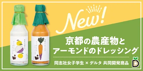 同志社女子大学×デルタの産学連携プロジェクト!京都の農産物とナッツを使ったオリジナルドレッシング2種を発売✨本商品は、「ご縁の力で価値を創る」 をコンセプトに、学生ならではの柔軟な発想と、デルタが培ってきた商品開発力を融合させることを目的にスタートしました。企画・試作・味づくり・デザイン・販売に至る