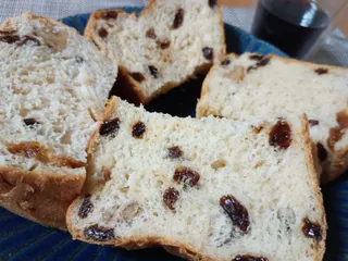 胡桃とドライフルーツの食パン 面倒くさがりなので、ホームベーカリーで角食に。いちじく入れたのにカット面にあまりいない💦レーズンいっぱい入れたのでより美味しかったですが、ハード系のパンのほうが好き…時間がある時に作りたいな😊