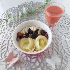 朝ごはん 朝のヨーグルトボウルにプルーンを入れました😋酸っぱい甘酒と割ったトマトジュースと一緒に頂きました💓
