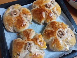 幸せな大きな胡桃パン作りました😊クリームチーズも入っていて、胡桃もチーズも大好きな私には…これを知ると普通の胡桃パンに満足できなくなりそうです🤭