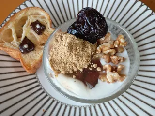 ハロウィンのお絵かきしたパン。中途半端に変な顔のデニッシュパンが残っていたので、ヨーグルトと📷️ ヨーグルトにはきなこや煮豆、生クルミやプルーンをのっけて食べました!