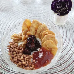 朝のヨーグルトボウルに、生クルミ、プルーン、カシューナッツ、ドライフルーツミックス、グラノーラ、ビーポーレンを入れました😋