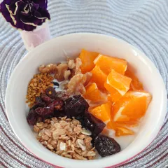 朝のヨーグルトボウル プレーンヨーグルトにビタミンCを混ぜ、プルーン、生クルミ、グラノーラ、ドライフルーツミックス、ビーポーレン、たんかん、グラノーラを入れました😋